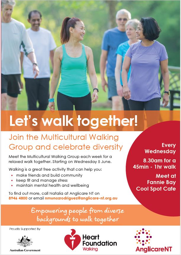 Let's Walk Together! Join a morning walk around Casuarina with our Multicultural Walking Group. Meet at STEPS Casuarina and connect with people from diverse backgrounds.